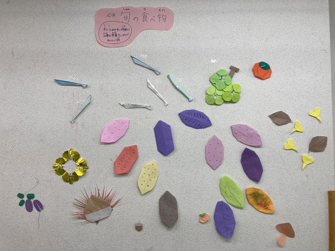 あきる野教室の川尻です。 秋に限らず、旬の食べ物というのはこの上なく美味しいですね。ということで、10月の壁面は美味しいものがいっぱい!子ども達も秋の味覚をよく知っているもので、楽しんで作ってくれています。 さて、みなさんはこの秋に何を食べましたか?それとも、これから食べる予定ですか?