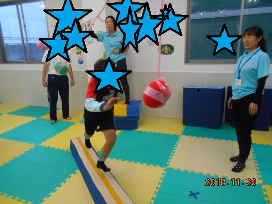 ロープにぶら下がったボールが5個あります。ボールは揺れていて、ボールに当たらないように進むのです。が、歩く場所は何と・・・