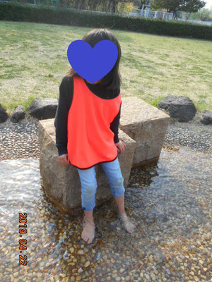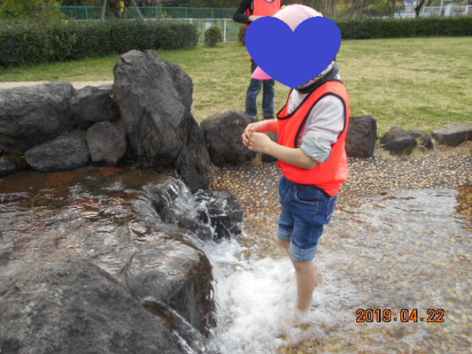 4月に水が入っているとは思わず、みんなびっくりです。子ども達は嬉しそうに靴を脱ぎ足を水の中へ。