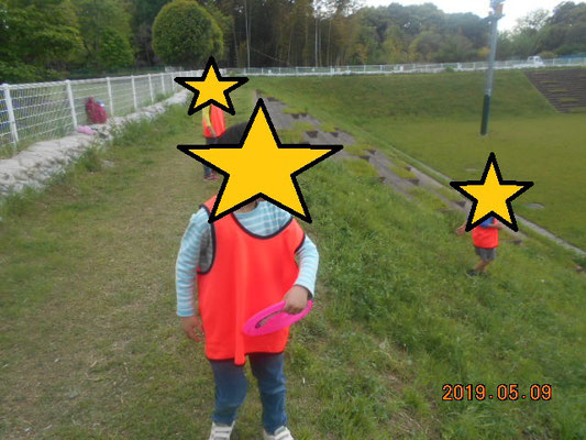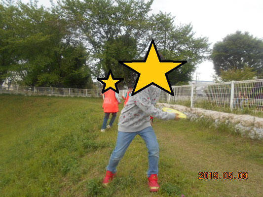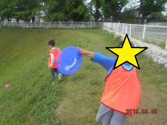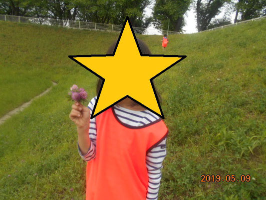 高い所からフリスビーを飛ばし、空中に舞うフリスビーが楽しくて、たくさん飛ばして遊びました。最初はあまり飛ばせなかった子も、回数重ねるごとに上手なり、遠くまで飛ばせるようになり、嬉しそう(^^)お花摘みをして花束を作って遊んでいる子もいました。