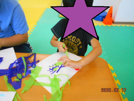 お花紙をびりびり破ってのりがついているところに貼り付けていきます。雨粒もつけました。破る、貼る…ビジョントレーニングですね!ちぎり方、貼り方が違っていて、個性あふれる作品が出来上がりました♪
