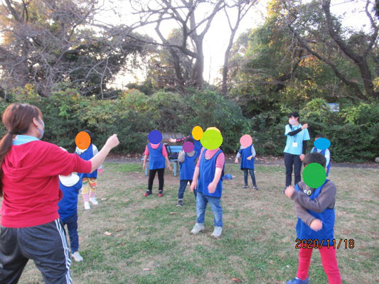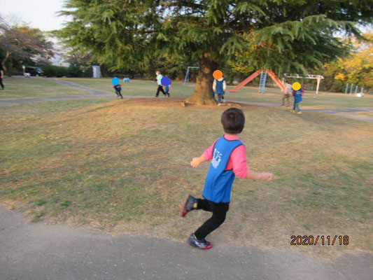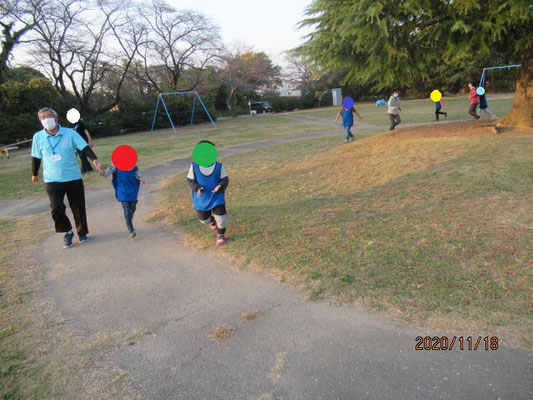 遊びたい気持ちを抑えてみんなで一本木の周りを走りました。