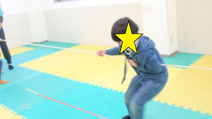 単純な運動ですが腕の力も足腰の力も使う物なのでとても体力を使います。最初は軽い気持ちで「綱引きやるよ~」と提供しましたが、いざ始まるとみんな本気モードで力いっぱい綱を引き「○○くんもっとひっぱって」「俺力強いから後ろ行くよ。」など子ども達同士で声掛けを行い参加する姿もありました。