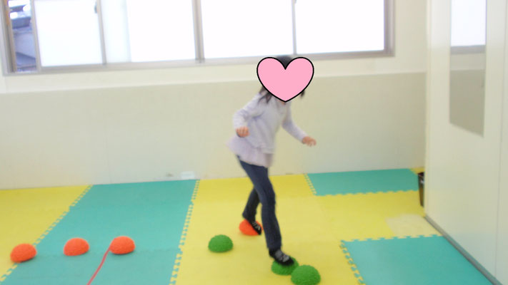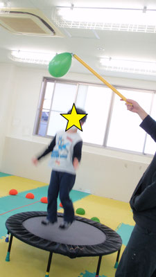 「そうしたらサーキットの中に少しだけ縄跳びいれていい?」と返すと「いいけど少しだけね」と言ってくれたので縄跳びサーキットを行ないました。内容として平均台の上で縄跳びを行い、トゲトゲボールを踏みながらトランポリンジャンプを行うものです。トランポリンジャンプには風船を用意しジャンプで風船タッチを行う仕様にしました。