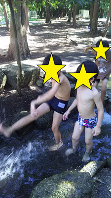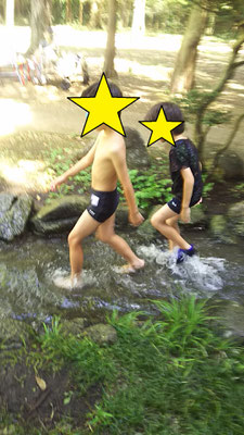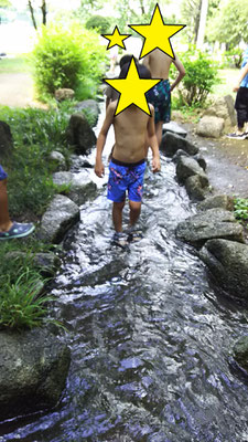 この公園は園内に水源があり川が流れています。この日は教室で水着に着替え公園へ向かいました。みんな一目散に川に飛び込み追いかけっこをしたり水中観察用バケツで水の中を観察したりと好きな遊びを行っていました。