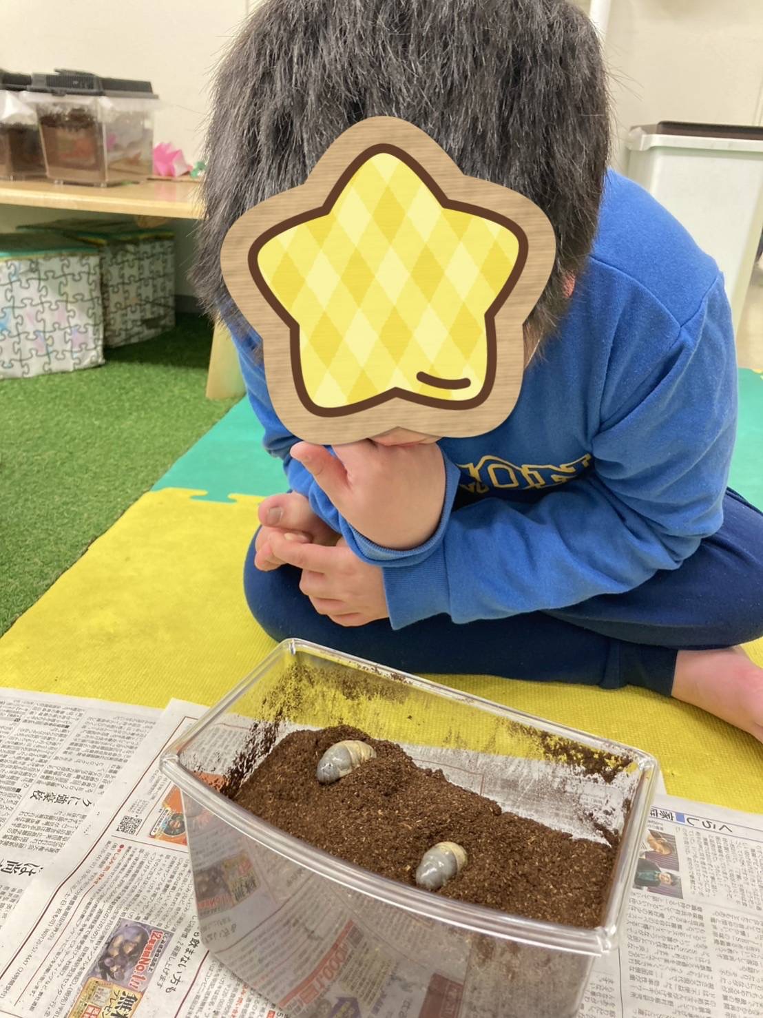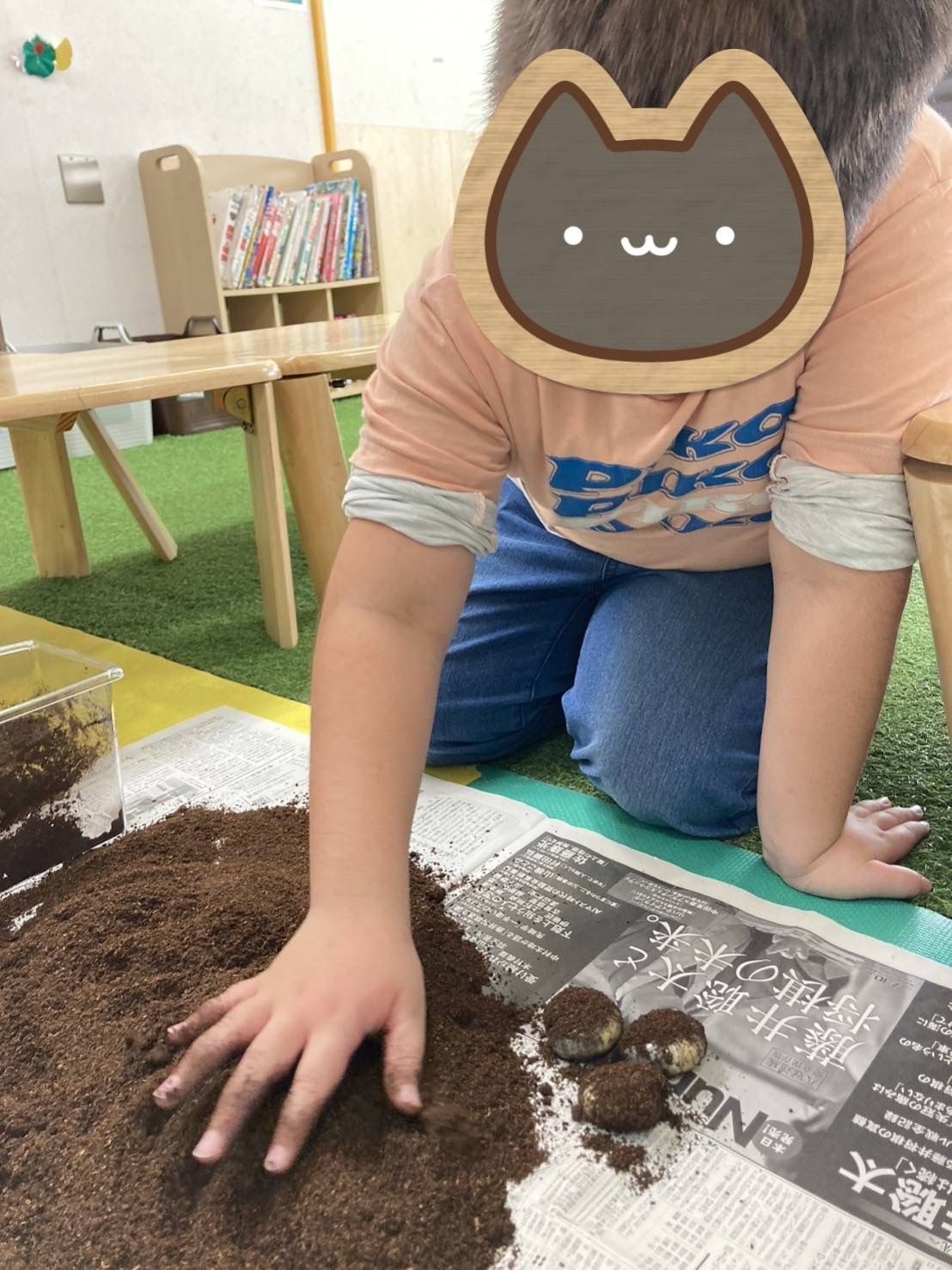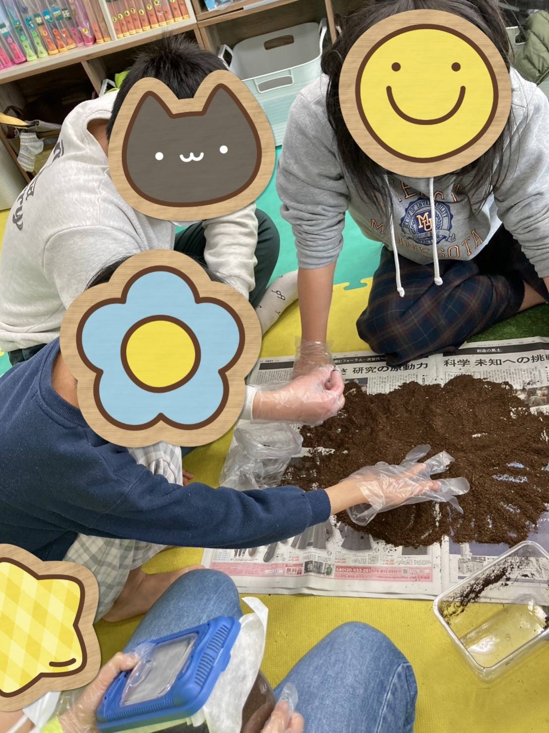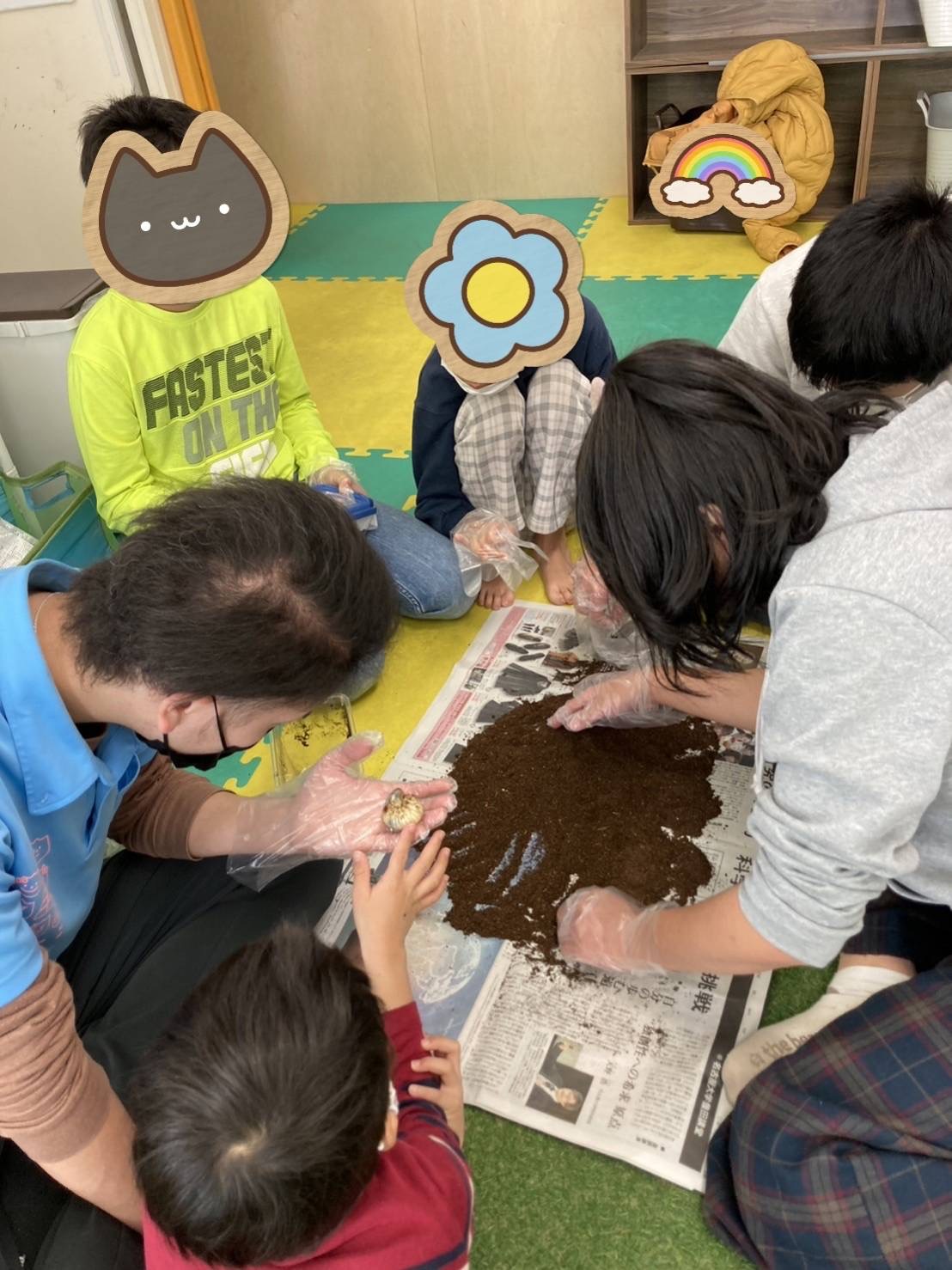 子ども達は、手袋をすると、職員と一緒に土のお掃除を始める為に、新聞紙にカブトムシと土を出すと「きゃー!きゃー!大きい〇んち!!」「ここにもあるー!!」と言いながらも〇んちを取り除いて、土をきれいにしてくれます(*^▽^*)