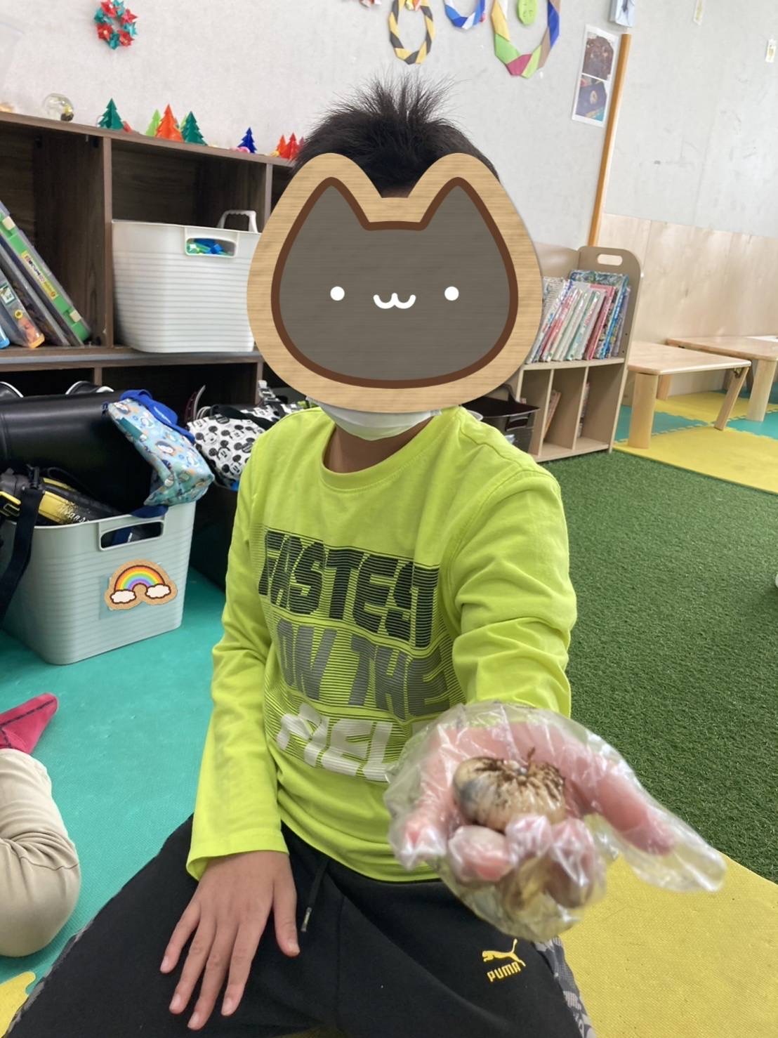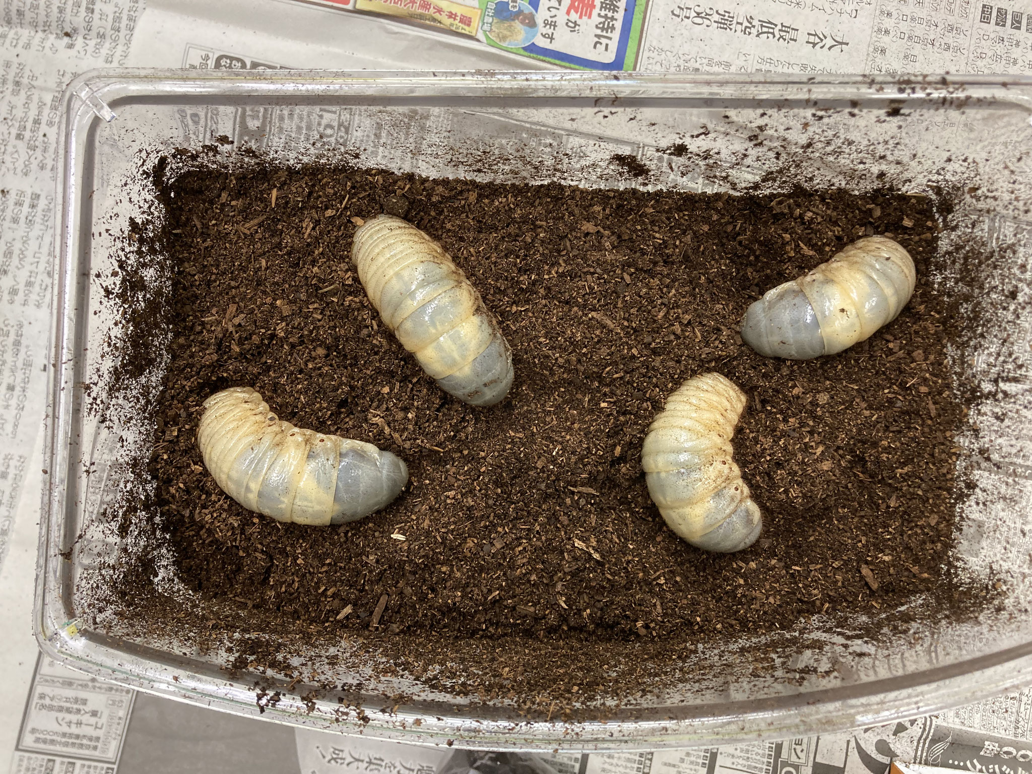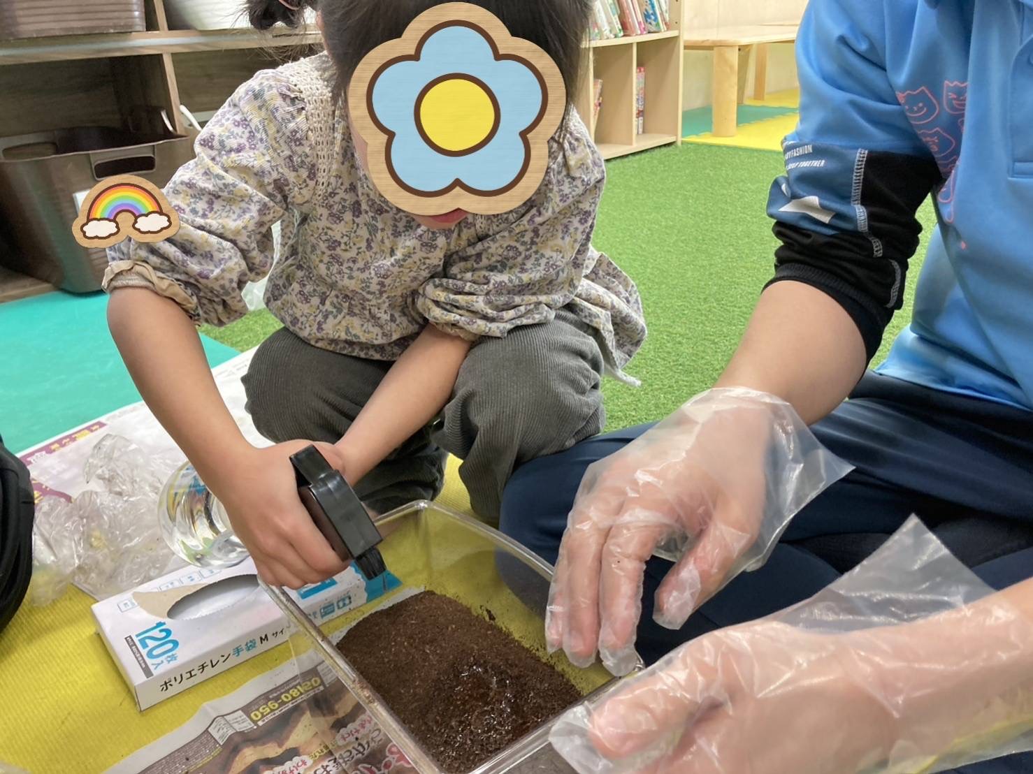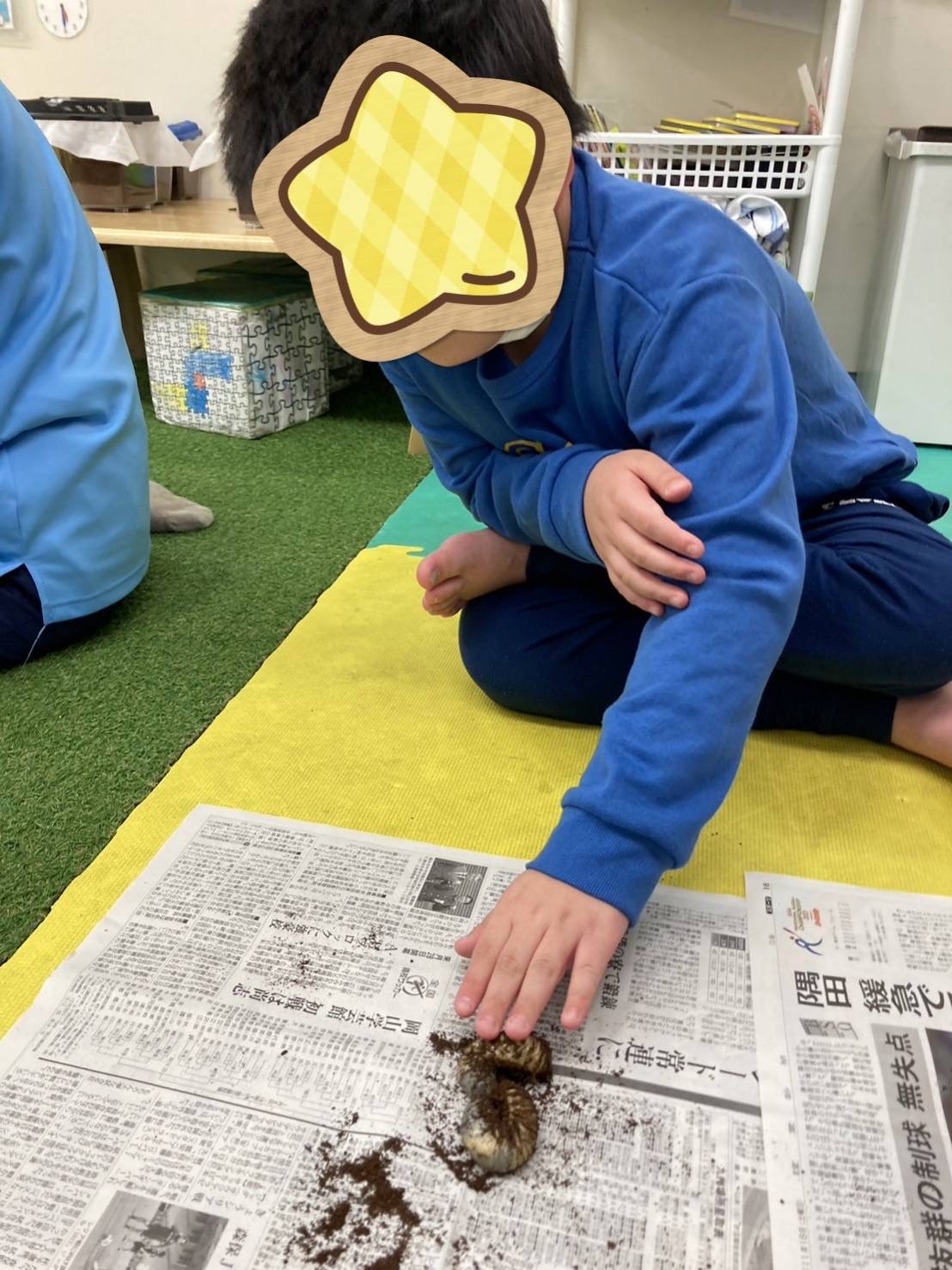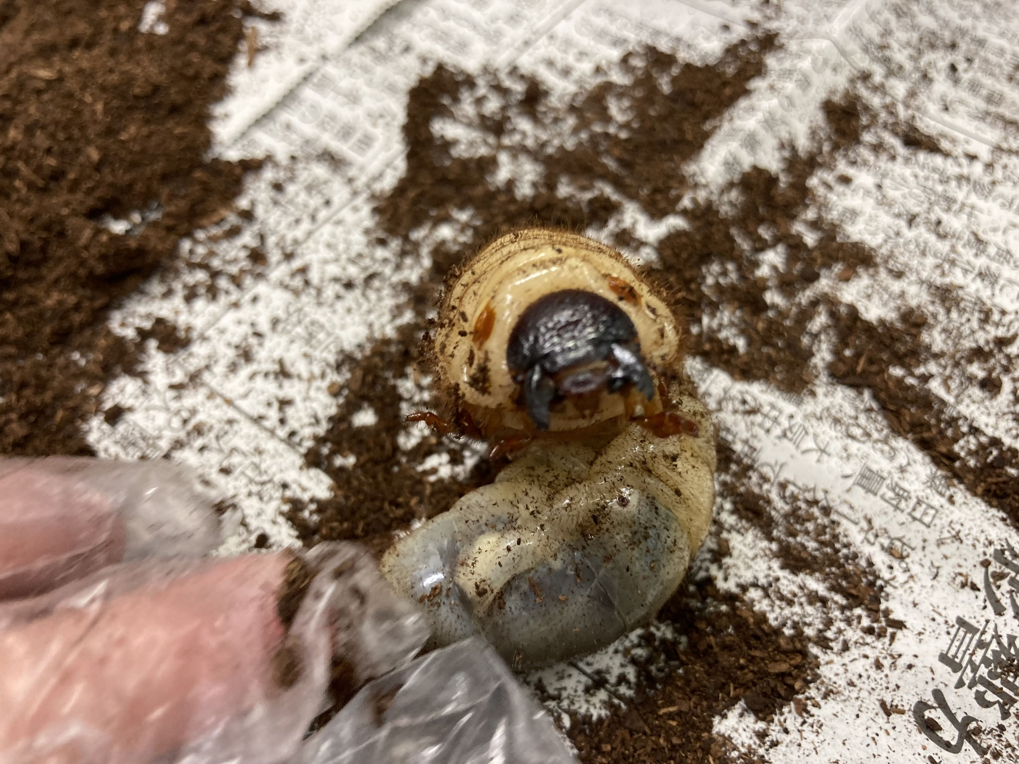 子ども達は、手袋をすると、職員と一緒に土のお掃除を始める為に、新聞紙にカブトムシと土を出すと「きゃー!きゃー!大きい〇んち!!」「ここにもあるー!!」と言いながらも〇んちを取り除いて、土をきれいにしてくれます(*^▽^*)