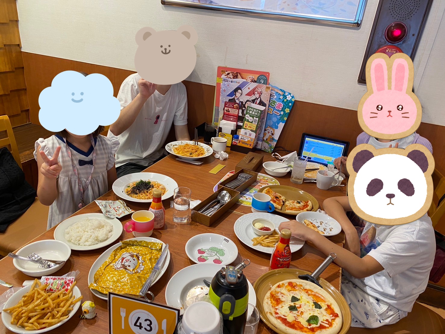 ハンバーグ、ピザ、スパゲッティなどなど...、ドリンクバーも全員で注文し、「カンパーイ!」「おつかれ~っ!」ココスにみんなで来られたことをジュースで乾杯し、今日の良き日を祝いました✨
