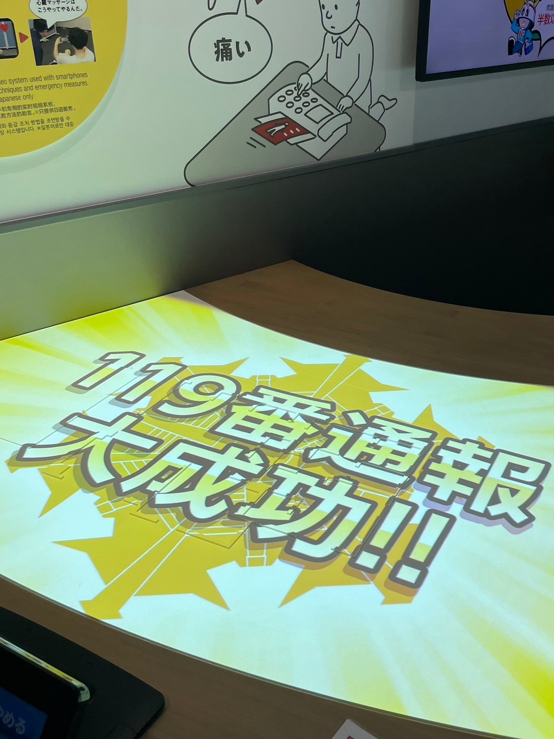 2Fにある通報訓練では、様々な場面での119番通報を練習しました。