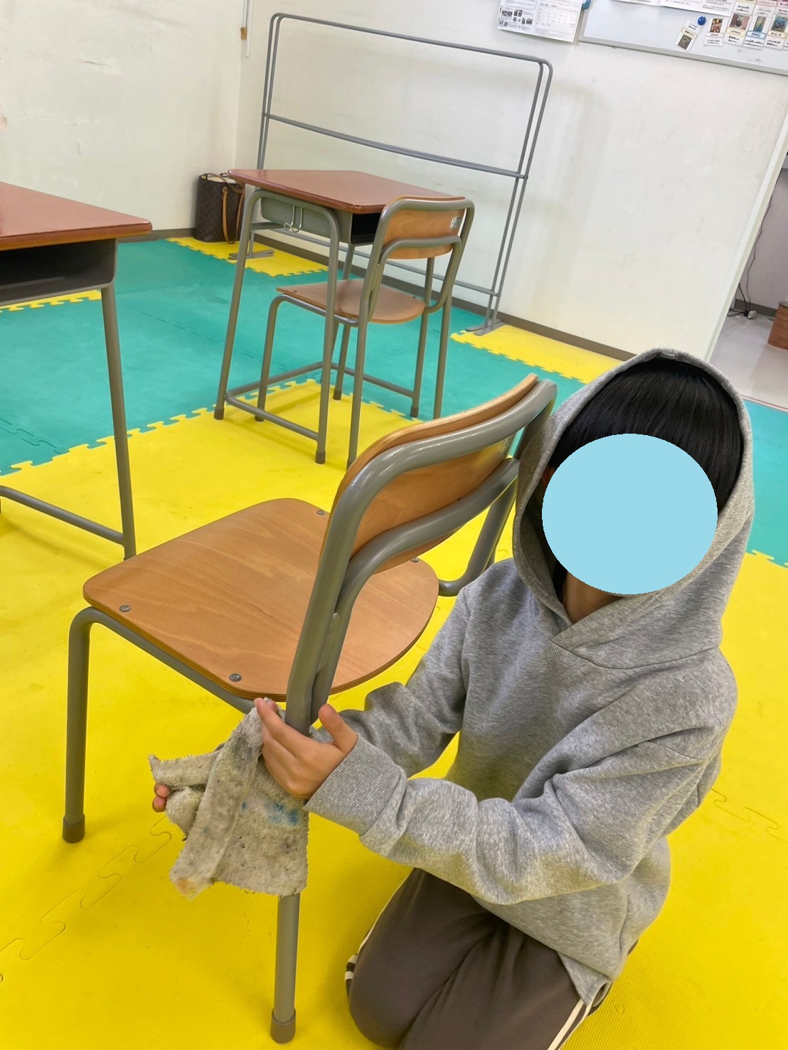 まずは机やいす、普段使っている荷物かごを丁寧に拭いていきます。学校の大掃除でも経験しているためか、手際よく進めてくれました。