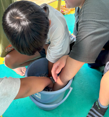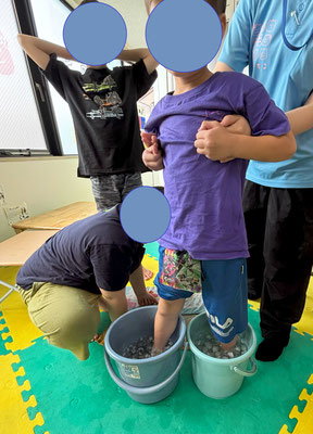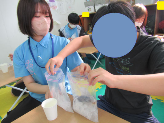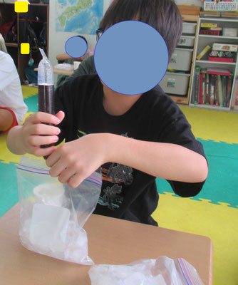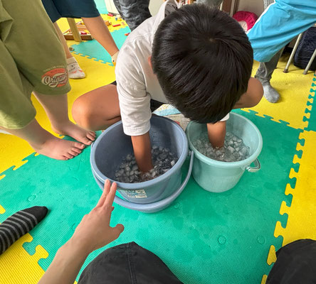 この科学の実験シャーベット作りは実験後の自由時間に、使った塩入りの氷水のバケツに手足をみんなで突っ込んで耐久レースをするところまでがセット!!