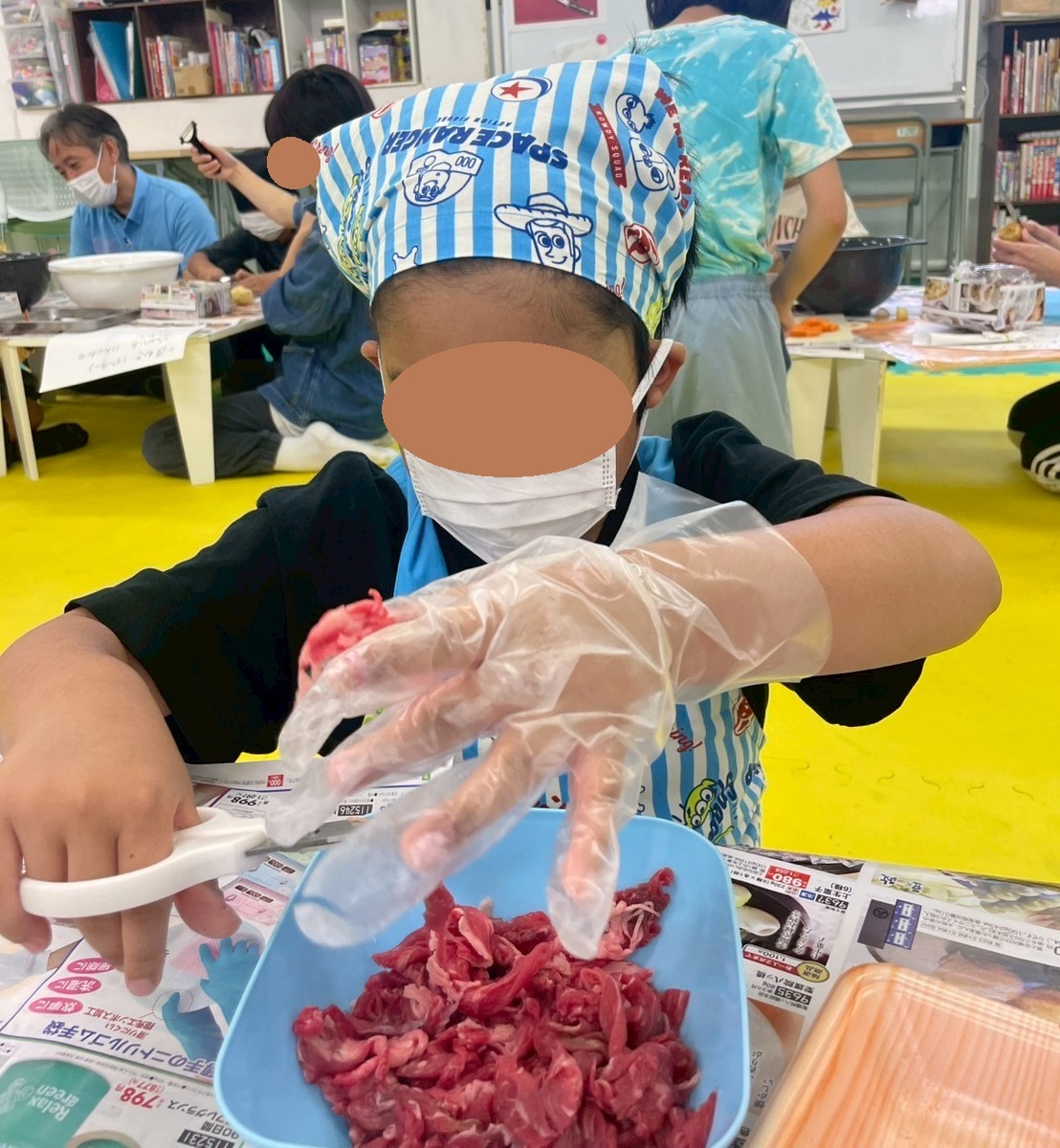 始めは職員と一緒にやっていましたが、慣れてくると一人で片手に肉、片手にはさみと上手に切ることが出来ていました。