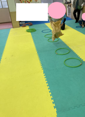 元気一杯の月曜日は、1回目は練習がてら袋に入って真っ直ぐ7mほど跳んでもらったのですが、2回目はフープを置き「島渡りジャンプ」を行いました。