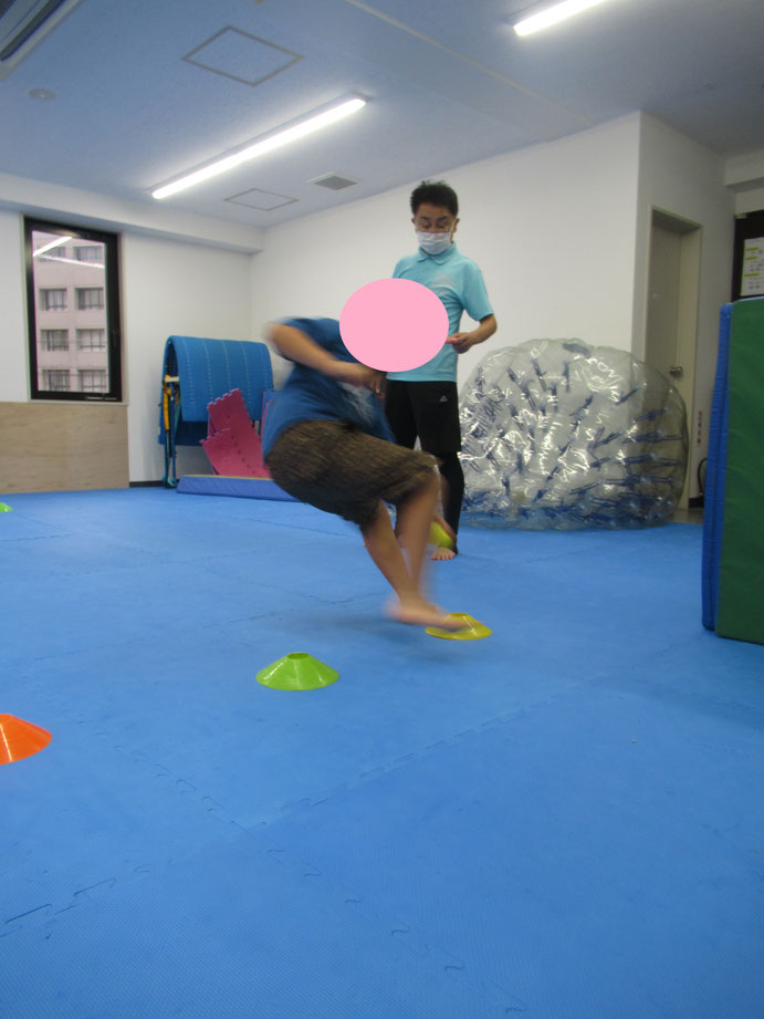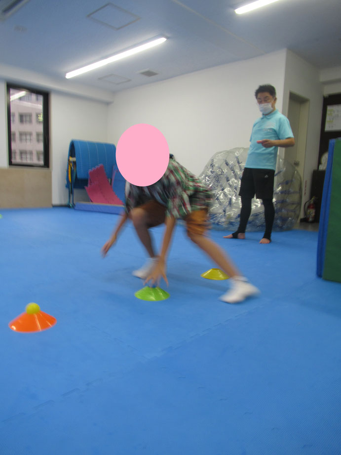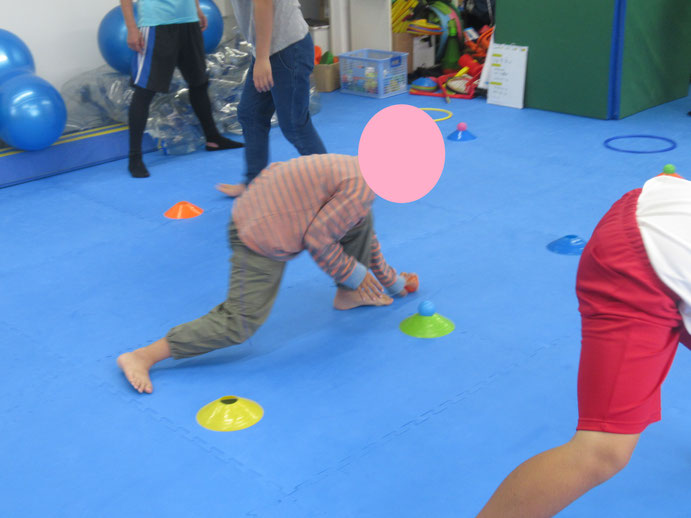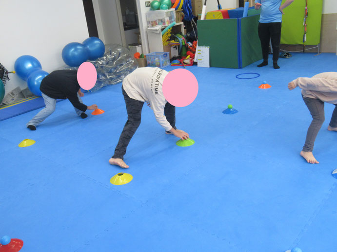 また、三人でマーカーコーンにセットされたカラーボールを移動するのもみんな楽しくチャレンジしてます、やり終わると「ええ~!」「負けちゃったからリベンジだ~!!」と何回もチャレンジする子もいました(*^^*)