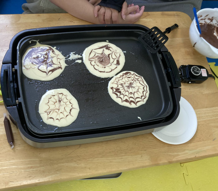 先週土曜日の調理は、「クモの巣ホットケーキ」を作りました。