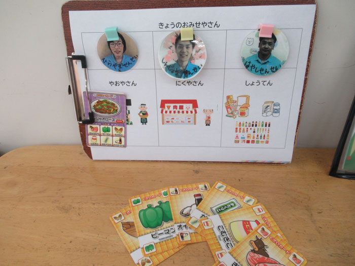 教室では、よくアナログゲームや普段から使うブロックなどを使った療育をしています。今回は、レシピを使ってお買い物ごっこをし、コミュニケーションの療育をしました。お店屋さんになっている職員は、話しかけられるまで反応せず、どうあっても自分から声を掛ける必要があります。また、何が欲しいのか言葉で言わなければ、その商品も出してくれません。テーブルに商品カードを並べるお買い物ごっこは指差しなどでも買えますが、とにかく話をしようという今回の内容では、それぞれの職員が個性豊かなキャラクターまで演じて会話を引き出していました。この日の女の子は、元気よく「こんにちは~!」からスタートし、全ての商品を言葉で伝えて青椒肉絲(こういう字を書くんですね)を完成させました。